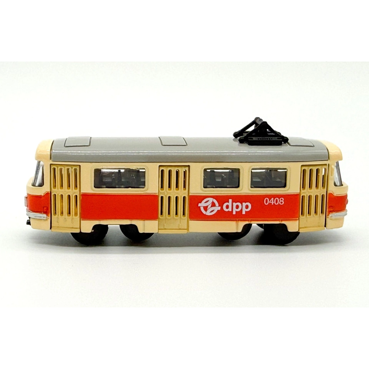Kovová retro tramvaj s logem DP, která jezdí na zpětný pohon. Vhodná je pro děti již od 3 let.