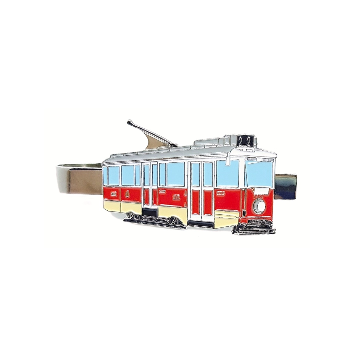 Kovová kravatová spona s motivem tramvaje ČKD Tatra T1, T2 a T3.