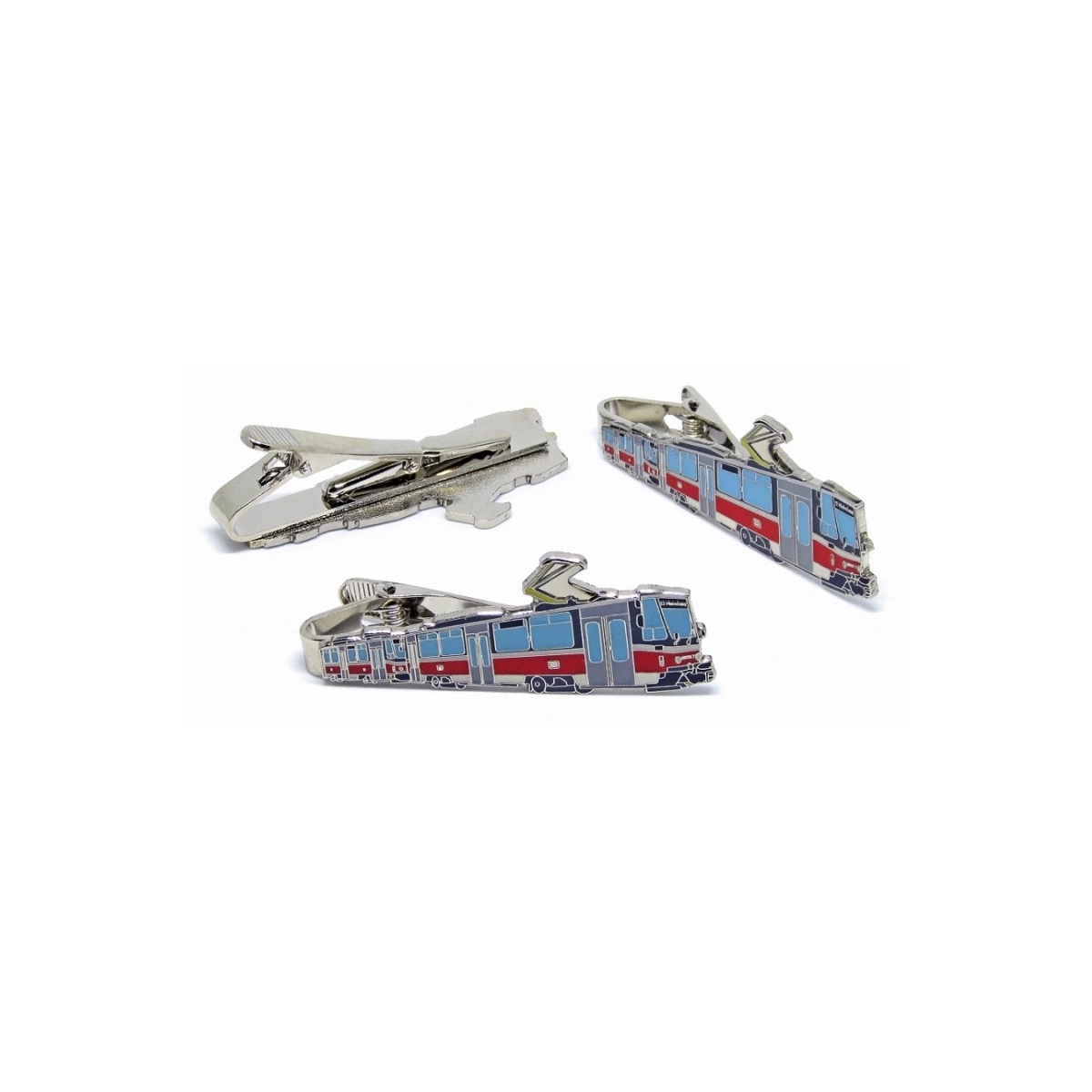 Kovová kravatová spona s motivem všech pražských vozů podzemní dráhy.