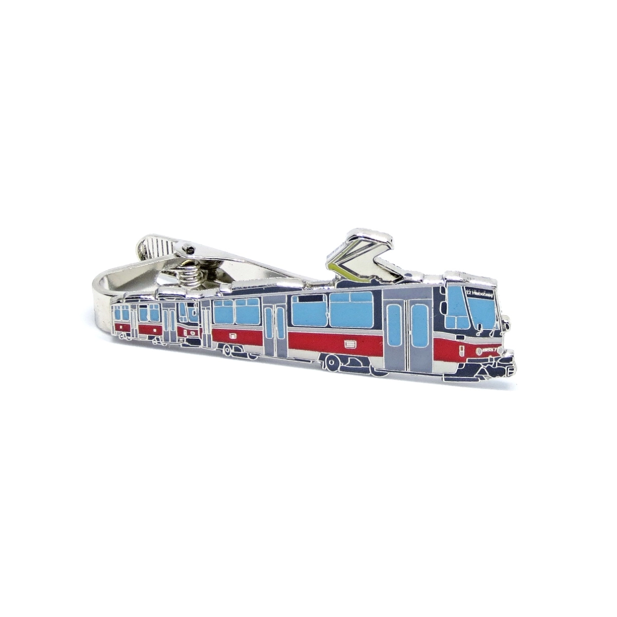 Kovová kravatová spona s motivem tramvaje ČKD Tatra T1, T2 a T3.