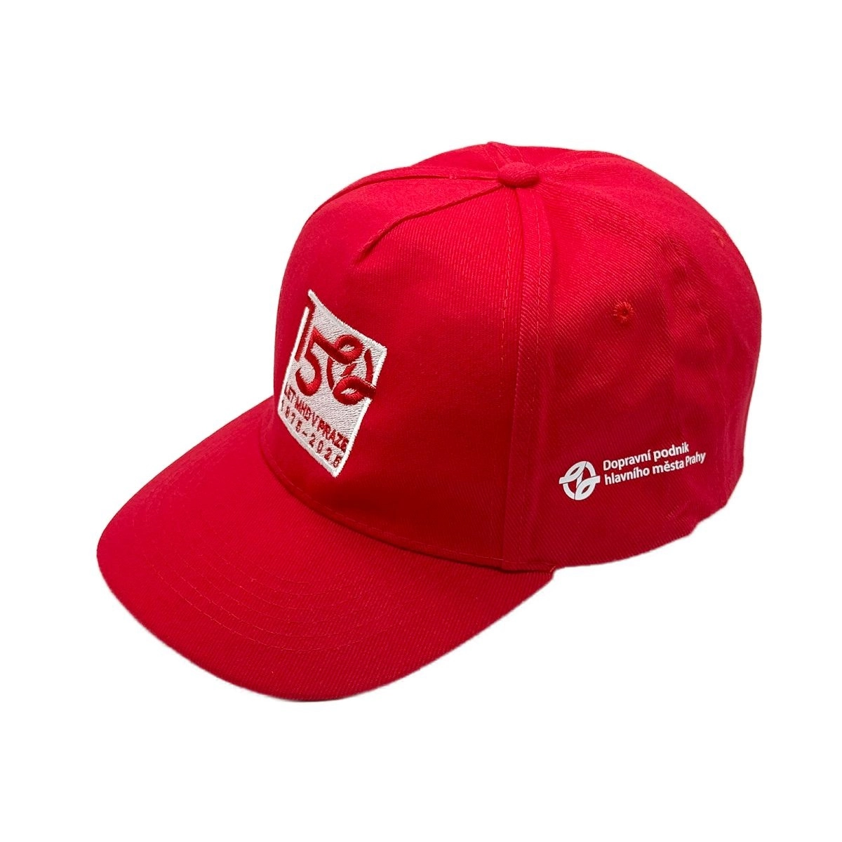 Kšiltovka v červené barvě s vyšitým logem výročí 150 let MHD zpředu a potiskem loga DPP na boku. Kšiltovka je lehká, má pětipanelový střih a mírně prohnutý kšilt. Velikost je možné nastavit pomocí posuvného textilního pásku s kovovou sponou.
