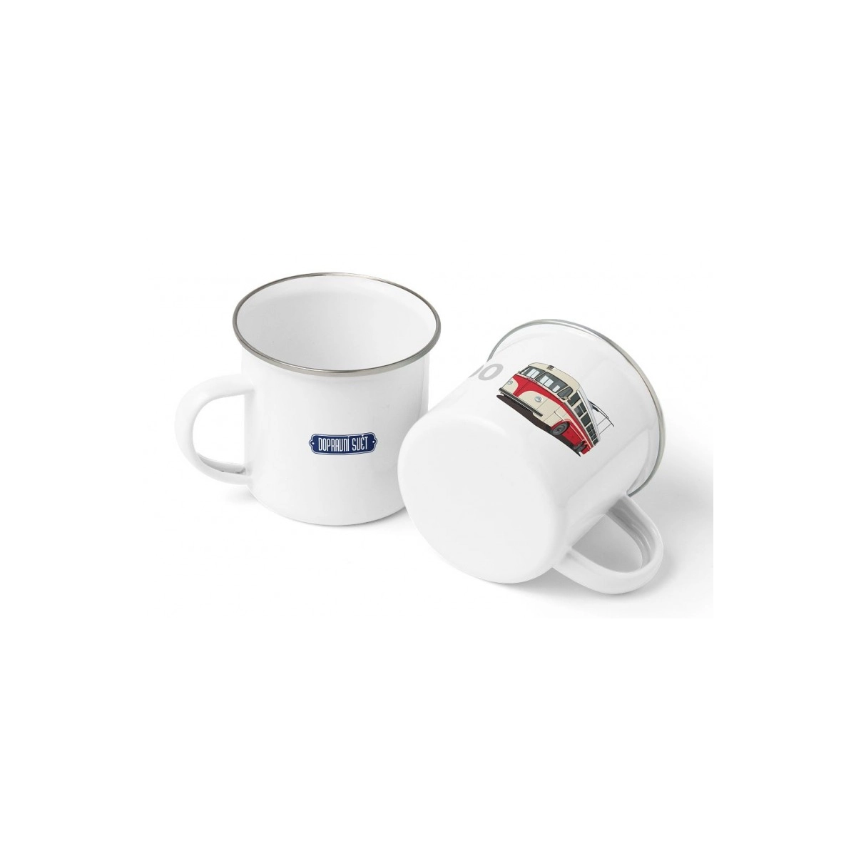Plechový hrnek s motivem kultovní mazací tramvaje a výstražného trojúhelníku.