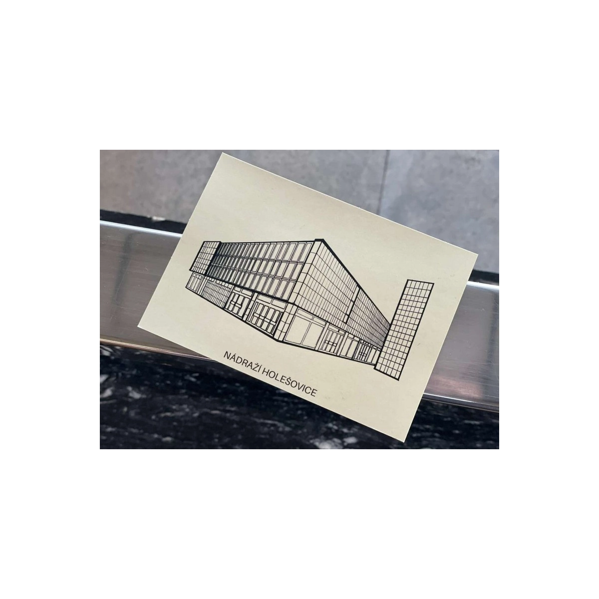Pohlednice s budovou stanice Strašnická z limitované art edice, která připomíná architekturu pražského metra.