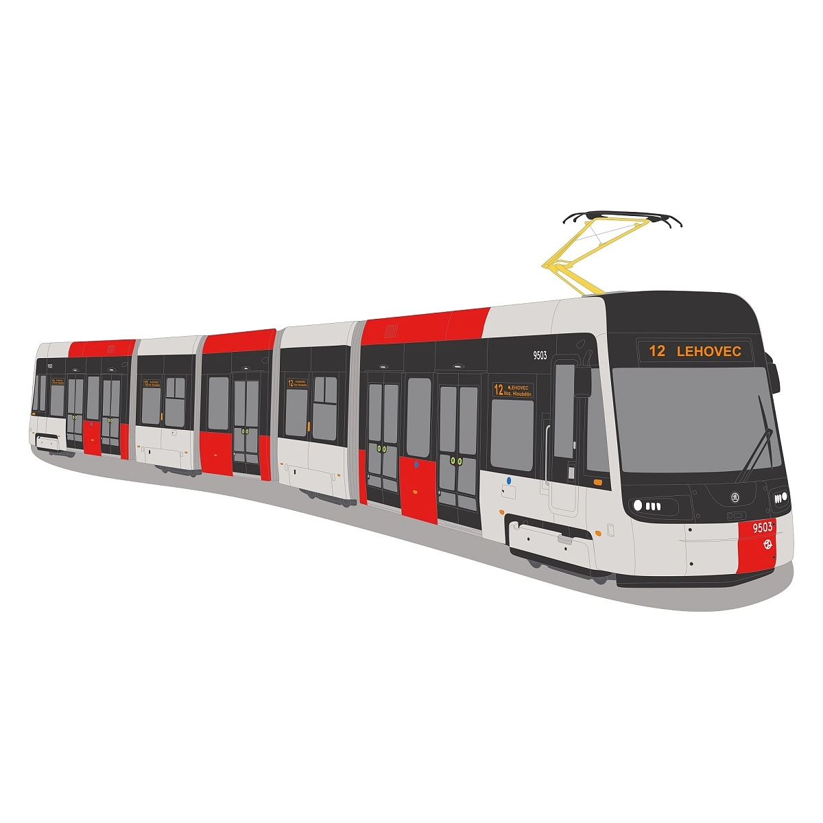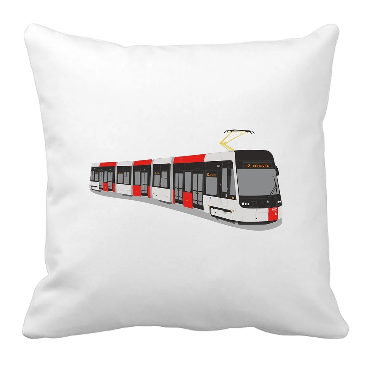 Bílý polštář s obrázky pražských tramvají