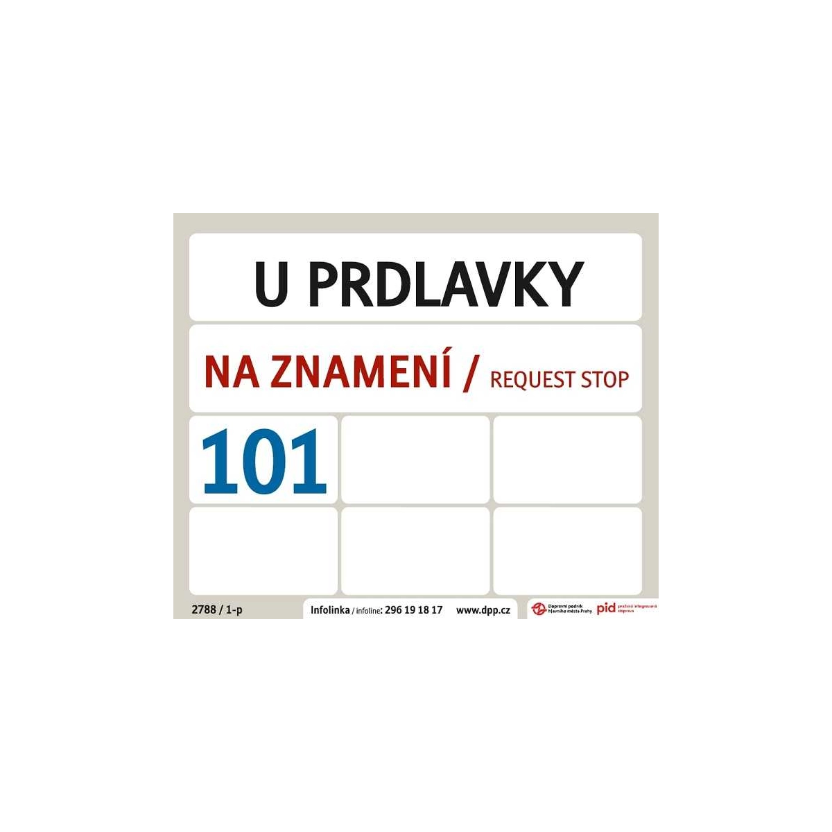 Zastávkové tablo populární zastávky na lince 101 v reálné podobě. Samolepka pro interiérové použití Rozměr: 40 × 33,5 cm (reálná velikost) Výrobce: Dopravní podnik hl. m. Prahy, akciová společnost